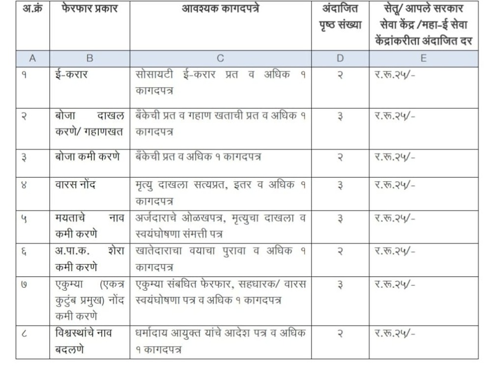 सेतू, आपले सरकार सेवा केंद्र, महा ई – सेवा केंद्र यांच्याकडूनदेखील आता फेरफार नोंदविण्यासाठी अपलोड करावयाची कागदपत्रे व अंदाजित दर निर्धारित केले आहे. त्यासाठी आता तलाठ्याकडे जाण्याची गरज नाही.. खाली दिलेला चार्ट पहा..
