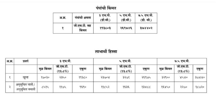 सौर कृषीपंपासाठी पात्र लाभार्थ्यांना पंपाच्या क्षमतनुसार प्रगवांतील खुल्या शेतकऱ्यास 10 टक्के आणि अनुसूचित जाती, अनुसूचित जमाती प्रवर्गातील शेतकऱ्यास 5 टक्के लाभार्थी हिस्सा भरता येईल. शासनाने या योजनेसाठी महाऊर्जास 1 लाख 4 हजार 823 सौर कृषिपंपासाठी मान्यता दिली आहे. त्यानुसार लोकसंख्येच्या आधारावर जिल्हानिहाय उद्दिष्ट निश्चित केले आहे. महाऊर्जामार्फत सद्यस्थितीत सुमारे 77 हजार 778 सौर कृषिपंप आस्थापित केले आहेत.
